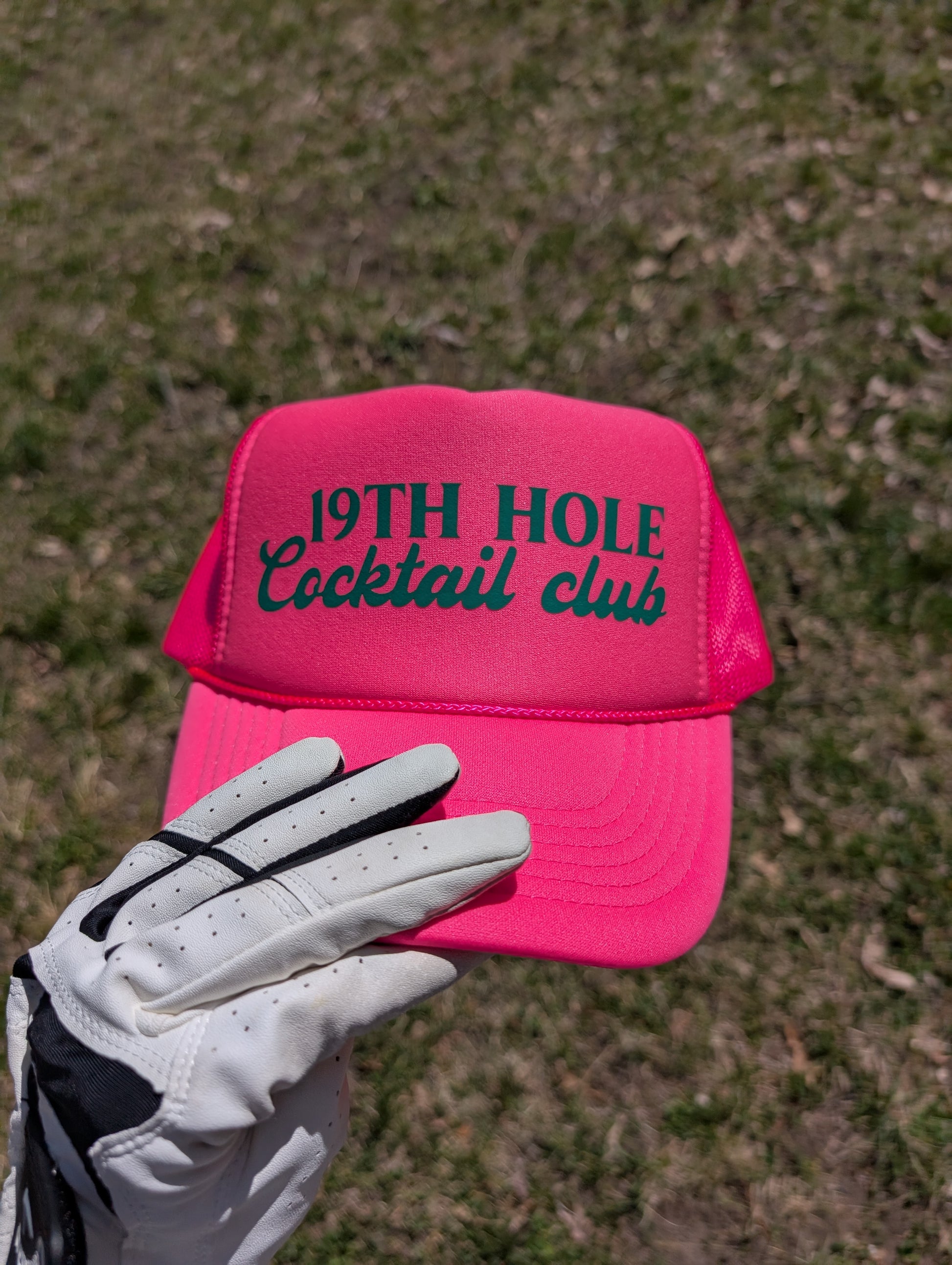 Make a bold statement with our neon pink trucker hat! This hat is designed to turn heads. The striking Kelly green "19th Hole Cocktail Club" lettering adds a touch of vintage golf charm. The breathable mesh back ensures comfort, while the adjustable snap closure provides a perfect fit. Perfect for sunny days on the green (or anywhere you want to make a statement!).