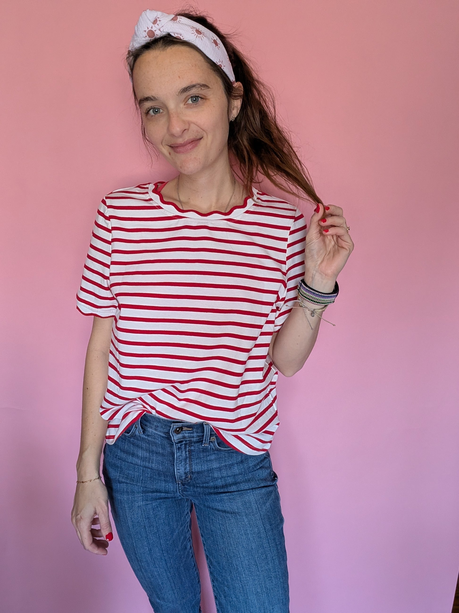 The Cherry Scallop Tee features vibrant red and white stripes and a fun lettuce-cut edge on the sleeves and neckline. It’s a nod to 90s nostalgia with a modern, sunny twist that’s ready to ship the second you fall in love with it.