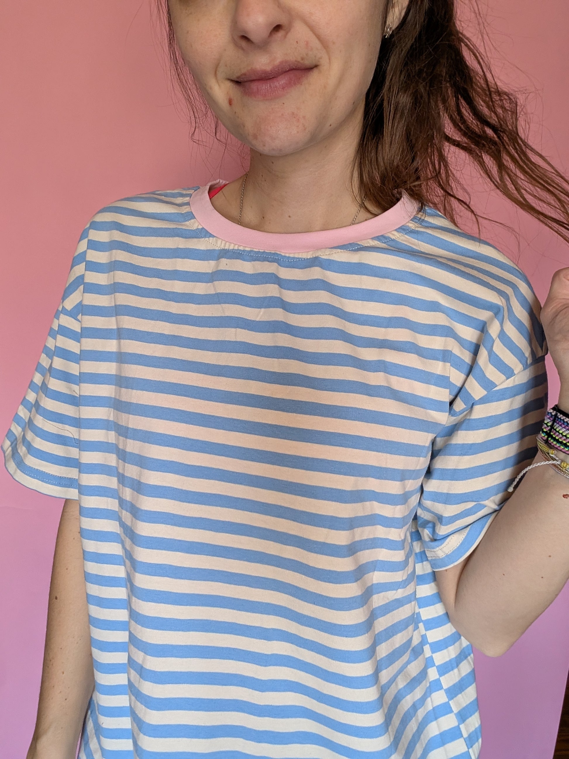 Design Details: Features clean, horizontal sky-blue stripes and a contrasting pink neckline for a subtle pop of color.